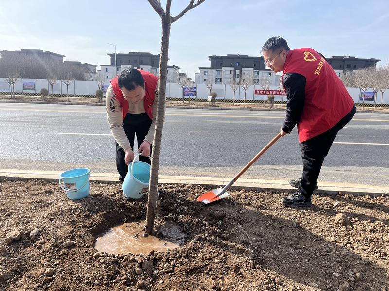 活动现场,大家身着志愿者红马甲,领取树苗、挥锹铲土、扶苗培土、浇水灌溉,每一个环节都一丝不苟。经过2个多小时的共同奋战,一株株错落有致的树苗与山间绽放的迎春花相映成趣,绘就一幅生机盎然的春日画卷。